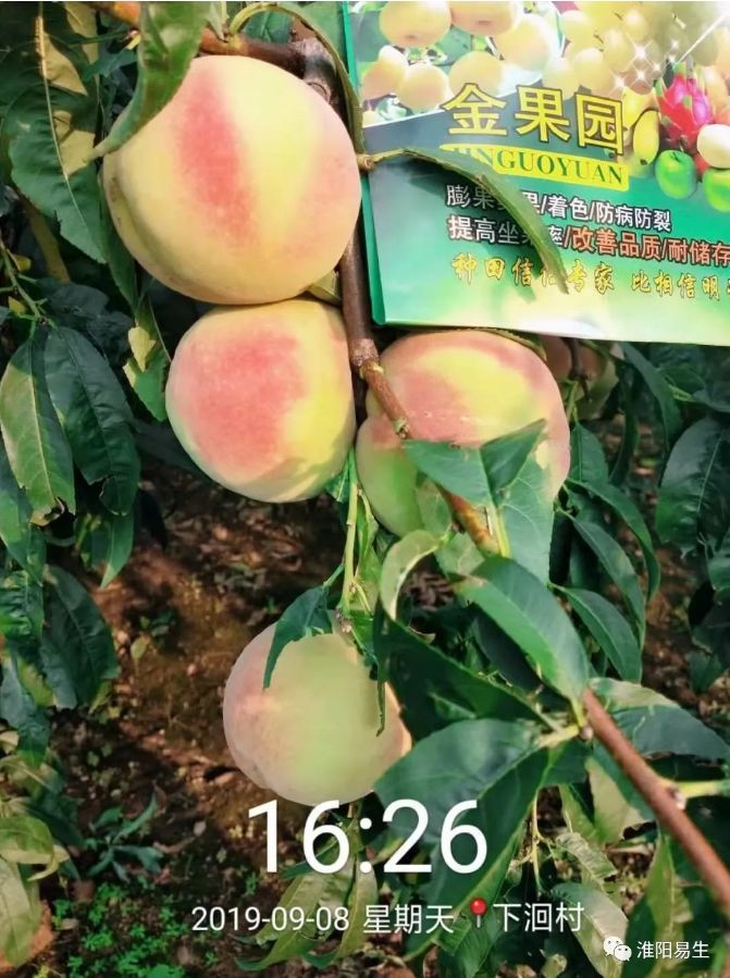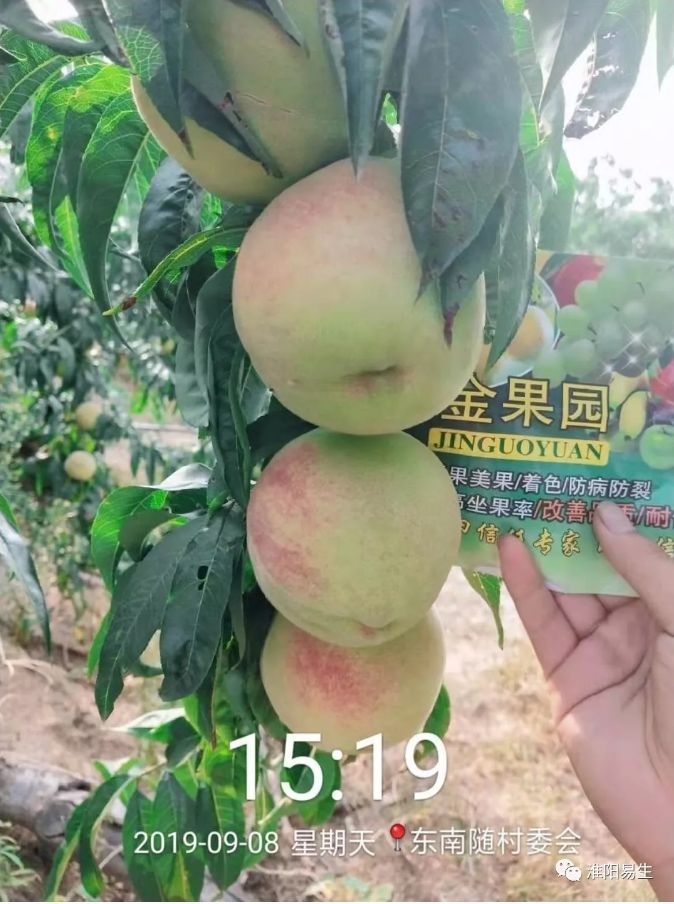 2019年易生科技售后服務(wù)組來(lái)到山東平度市店子鎮進(jìn)行噴施金果園的效果回訪(fǎng),可以看到噴施過(guò)金果園的毛桃個(gè)頭大且均勻,顏色鮮亮,上色均勻,每個(gè)毛桃直徑都在80-90mm以上。未噴施金果園的毛桃個(gè)頭小,且果皮表面有一層灰白色的物質(zhì),霧蒙蒙的感覺(jué)不鮮亮。