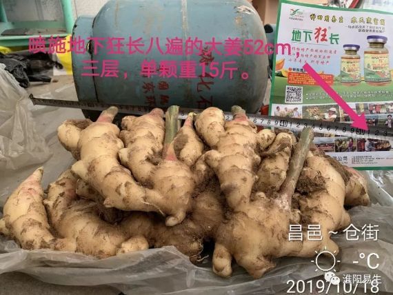 這個(gè)是我們一位大姜種植戶(hù)噴施地下狂長(cháng)八遍的大姜,長(cháng)52cm,長(cháng)了三層,單顆重15斤。這個(gè)數據種植大姜的人都知道,這顆大姜真的可以稱(chēng)得上是大姜王了。