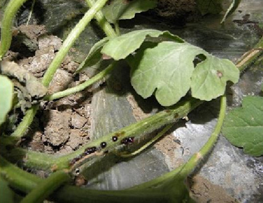 發(fā)病規律;枯萎病主要靠土壤傳播,種子也可攜帶病菌,發(fā)病初期在瓜秧上裂口,流出菌濃,1—2天候成粉紅色或棕黑色,瓜農俗稱(chēng)流膠病見(jiàn)圖(1)